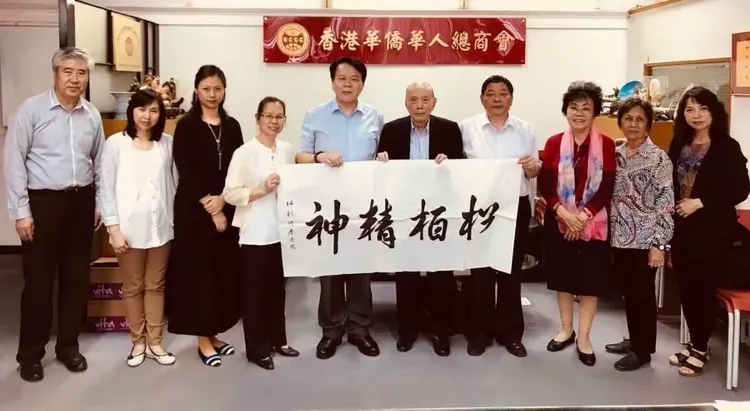 比利時世界文化藝術交流中心主席侯杏妹教授向香港華僑華人總商會古宣輝會長贈送墨寶《松柏精神》。左起:劉佐、李燕香、陳悅、侯杏妹教授、曾昭詢、古宣輝會長、陸惟華博士、陳玉梅、陳小鳳、鐘麗娟
