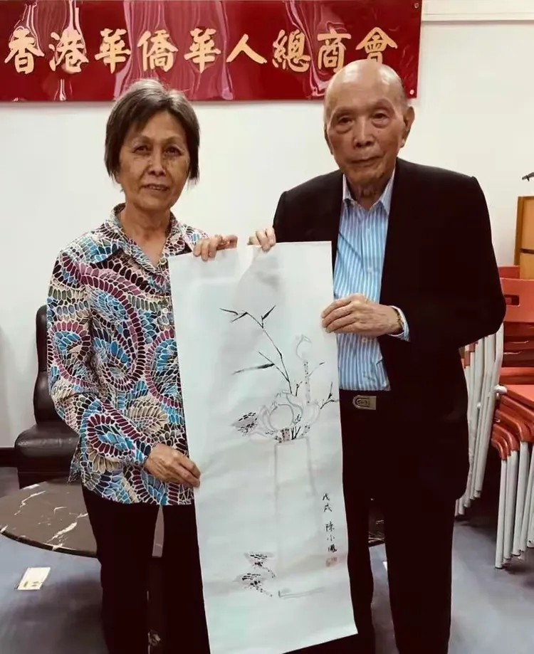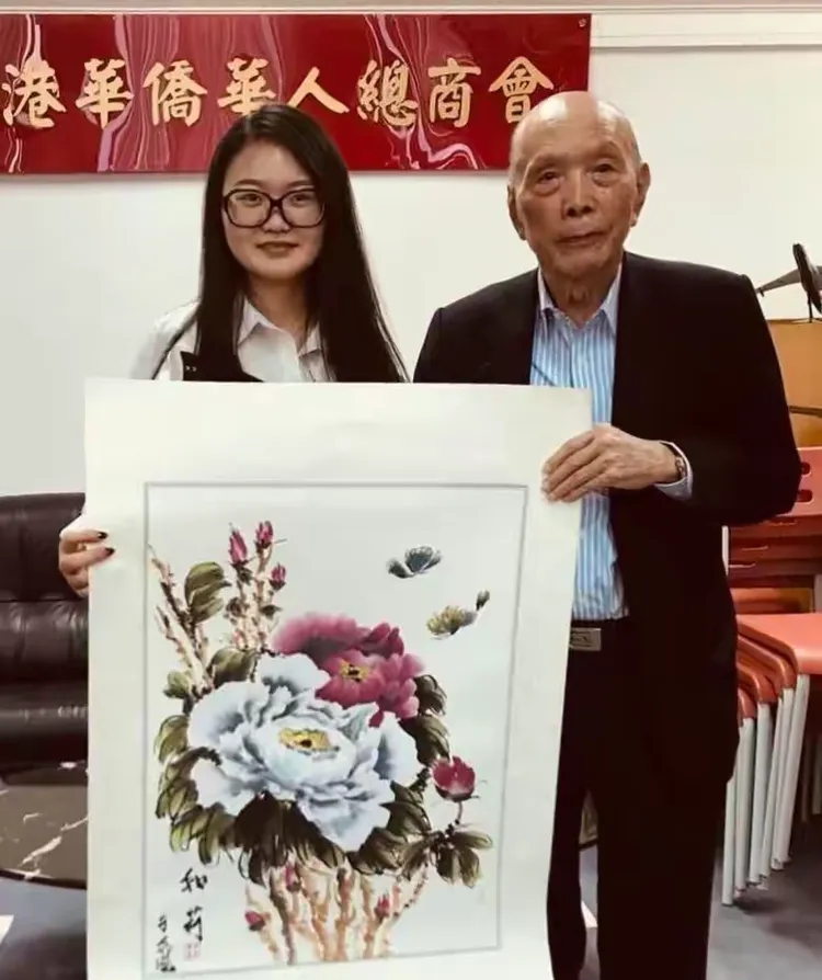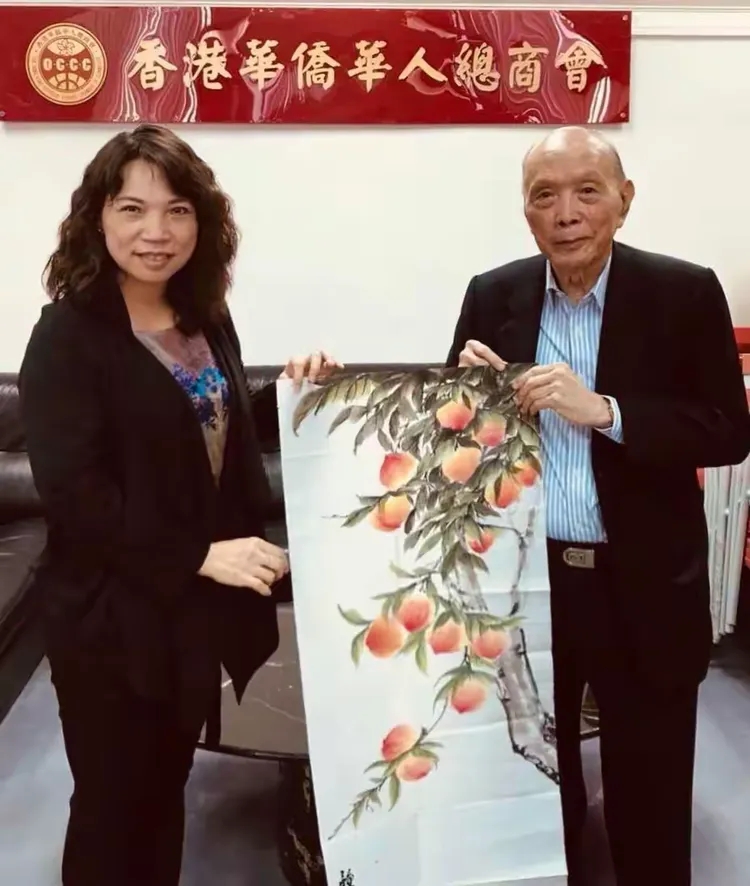 香港牡丹苑畫會主席曾莉向香港華僑華人總商會贈送了自己的墨寶,古會長代表商會接受了作品