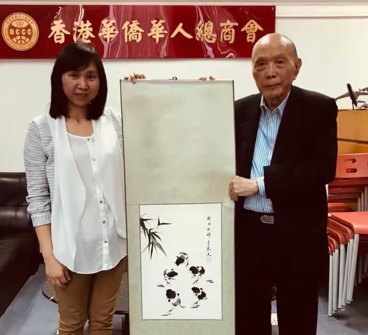 香港金紫荊國際書畫家聯合會學藝長鐘麗娟向香港華僑華人總商會贈送了自己的墨寶,古會長代表香港華僑華人總商會接受了作品